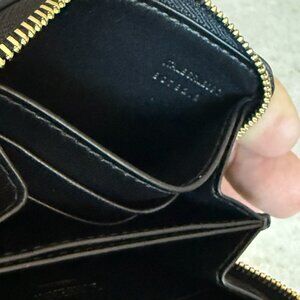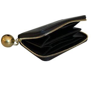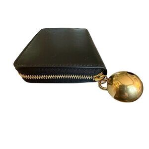 The Burberry EKD Black Leather Zip Wallet is a unisex accessory made in Italy from high-quality leather. The wallet features a solid black color and a brass charm for added style. With a size of 4 3/8 inches in length and 3 1/4 inches in width, this wallet is compact and practical for carrying essential items. Its zip closure ensures security for your belongings. Perfect for both men and women, this Burberry wallet combines elegance with functionality in a sleek design.