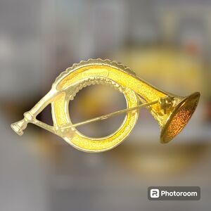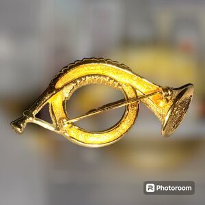 Elevate your accessory collection with this exquisite Burberrys of London signed pin brooch. Crafted from high-quality gold-plated materials, this vintage piece showcases a unique horn design that adds a touch of elegance and sophistication to any outfit.