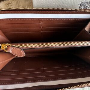 Compact and stylish zip around leather wallet. Multiple card slots and pockets.