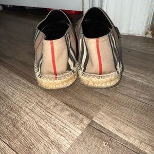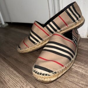 Chic espadrille flats with a camouflage pattern. Features black, red, and tan colors.