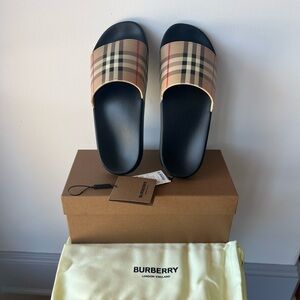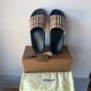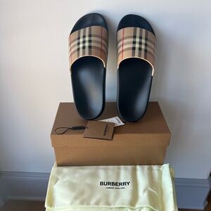Step up your poolside style with this slide branded with the iconic Burberry check and set on a comfy contoured footbed.