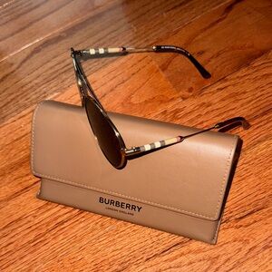 Authentic Burberry aviator style sunglasses with gold frames and brown lenses. Comes with a sleek tan case. Perfect for any look. Sunglasses have hardly been used, in like-new condition.