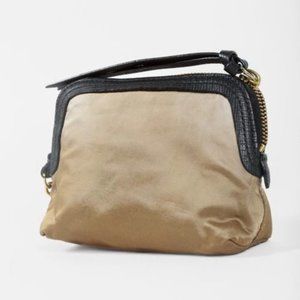 Composition: Satin, leather trim, gold-tone hardware, fabric lining.