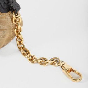 This pouch from Burberry is made in a gold satin, and features gold-tone hardware, black reptile-texture leather trim, a carabiner-attached chain, a top zip closure with a long zip pull, and is lined in a black logo-print jacquard.