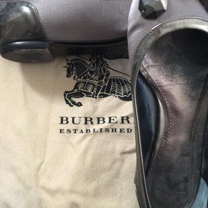 Elegant Burberry flats. Gray fabric with striking black embellishments. Perfect for a chic look.