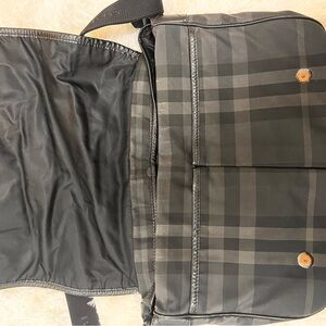 Elegant Burberry messenger bag with gray and black plaid design. Features adjustable strap and sleek buckle accents.