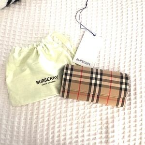 This gorgeous classic Burberry long Check wallet is timeless and stunning! Made from calf leather, designed with Burberry's classic design! Featuring a Magnetic Closure, 2 Bill Compartments, Zippered Coin Purse, 12 Card Slots, 1 Flat Pocket On The Back, 2 Flat Pockets. Comes with Authenticity Card, Price Tag, dustbag, papers featured in last photo above!