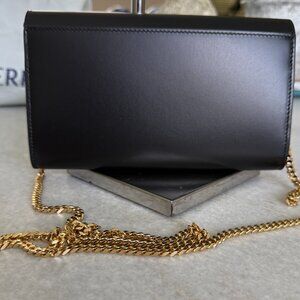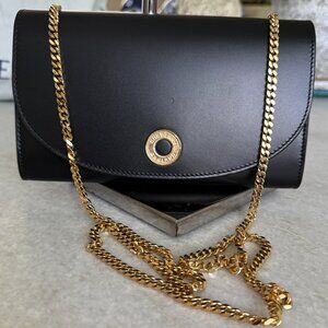 A wallet made from smooth calf leather with a logo-engraved closure. Use the detachable chain strap to wear as a mini bag or style as a clutch.