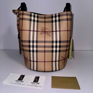This is an authentic BURBERRY Haymarket Check Colours Small Lorne Bucket Crossbody in Black. New with Tags. Has been kept in storage.