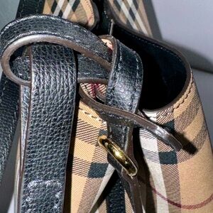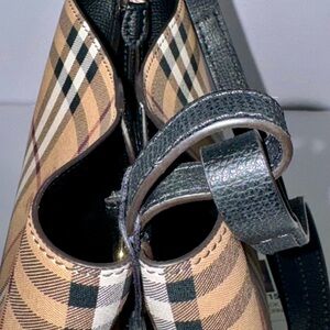 This bucket-style bag is crafted of Haymarket check canvas with a sturdy black leather base. The bag features a black leather base and an adjustable shoulder strap with gold hardware. The top is open to a black leather interior.