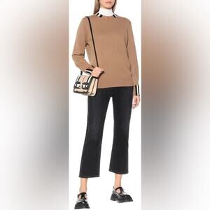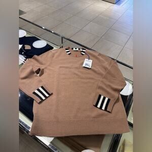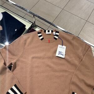 This Burberry sweater offers timeless elegance. The classic tan color is complemented by red accents. The crewneck design features a unique striped collar and cuffs, adding a modern twist to the traditional knit fabric.