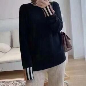 Experience timeless elegance with this Burberry crewneck sweater, designed in a cream body accented by black stripes at the neckline and cuffs. Crafted from a premium wool and cashmere blend, it delivers both luxury and comfort. Its slightly relaxed fit makes it a versatile staple, blending classic style with modern ease.