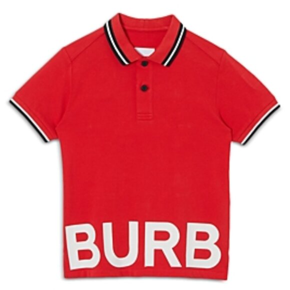 Stylish Burberry Jerome Pique polo shirt. Bold red color with white lettering. Classic collar design. Used once for Special Occasion only but in excellent condition. Said size 8 but is more size 7