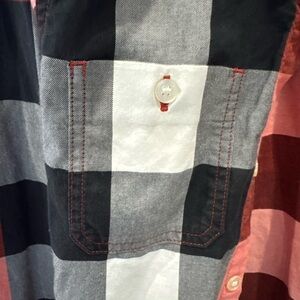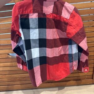 Charming Burberry plaid shirt for kids. Features a classic red, black, and gray pattern. Ideal for any occasion.