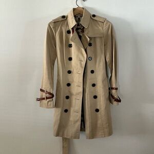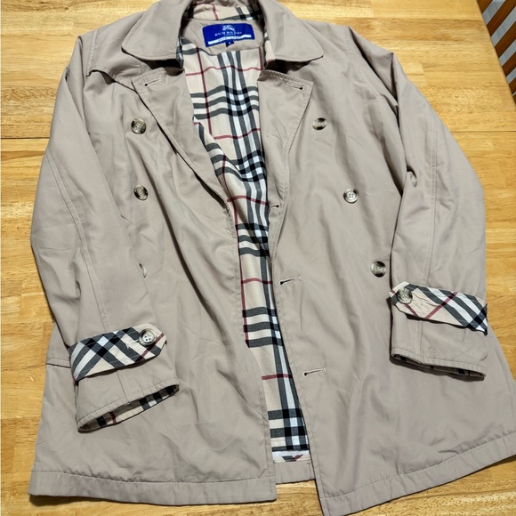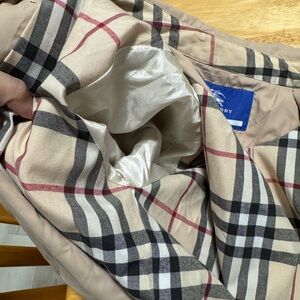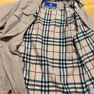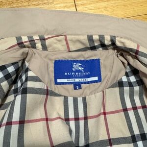 Gorgeous Burberry Blue Label (exclusive to Japan) lightweight trench coat with the classic Burberry plaid touches! Runs small. I’m a Small but this is a little tight on me. No flaws to speak of except a teeny smudge as pictured. Otherwise, perfectly clean and ready to wear!