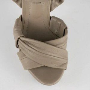 Khaki leather Burberry platform sandals with resin heels and zip closure at counters.