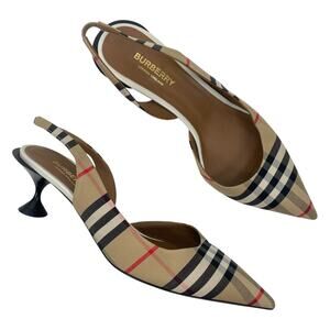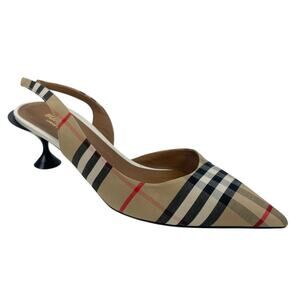 Style Tags: Burberry, Leticia, Slingback, Kitten Heel, Low Heel, Archive Check, Tan, Neutral, Beige, Signature Check, Burberry Check, Pointed Toe, Leather Lining, Leather Sole, Elegant, British Luxury, Classic, Dress Shoe, Office Chic, Sophisticated, Timeless, Designer Heels, Luxury Footwear, Women’s Pumps, EU 39, Made in Italy.