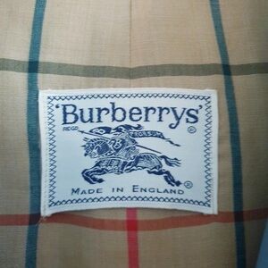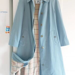 Elegant Burberry trench coat in light blue. Features a classic belt and button closure. Perfect for stylish layering.