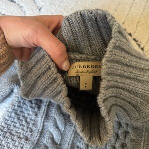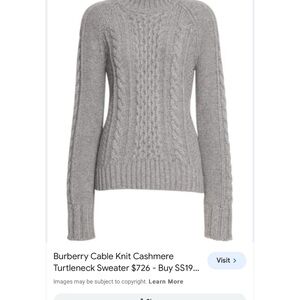 This Burberry sweater features a luxurious light gray color and a prominent ribbed turtleneck collar. The intricate cable knit pattern adds texture and warmth, making it an ideal choice for winter wear.