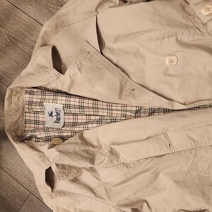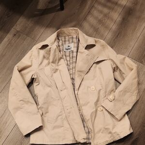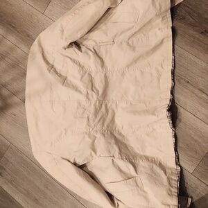 Elegant Burberry jacket in light tan. Features signature plaid lining and button accents.Size Medium Missing the coat strap and a small stain top right chest area please see picture