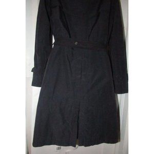 Burberry London, size 10, black, military look, belted, all weather coat! This stylish, all weather jacket has long, belted sleeves and a 1960's military spy look. It has a pointed traditional collar & a tailored cut that is very flattering. This 3/4 length jacket is double- breasted and has the iconic Burberry Nova Check plaid collar and lining. The perfect addition to your wardrobe! Don't miss out! Size: 10; Measurements: Bust: 48"; Length from under the arm to bottom: 35"; Sleeve: 18". N0701