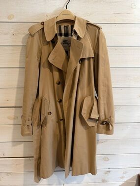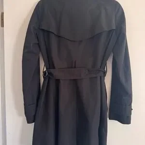 The quintisential black Burberry trench coat. Double-breasted with belted waist. Timeless design, with traditional Burberry check plaid lining.