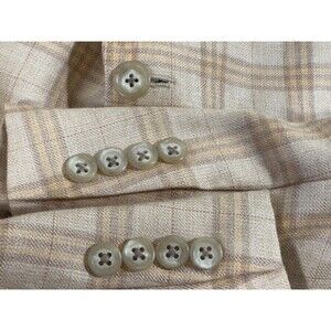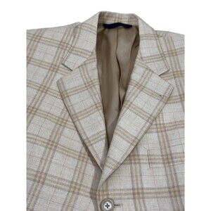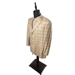 This elegant Burberry suit, from the Saks Fifth Avenue collection, features the Kensington model in size 42R with sleeves of 25 inches. Crafted from a luxurious blend of 80% ramie and 20% silk, it offers a lightweight and refined texture. Made in the USA, this beige plaid suit combines timeless sophistication with premium quality, ideal for versatile styling.