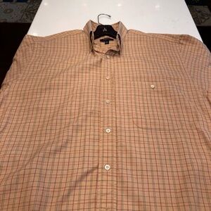 Excellent condition. Men’s Burberry London button down short sleeve shirt. Tan, striped, front pocket, button down collar. Size medium. See photos for measurements