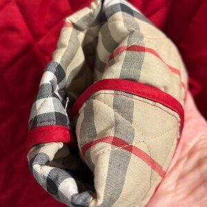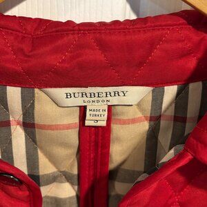 Red with signature Burberry plaid lining. Snap up. Two front pockets. Size S 100% polyester outer. Cotton blend lining. Excellent Used Condition. No staining at wrists or collar. Quilted threading intact. Flat lay measurements are approximate.