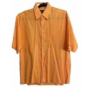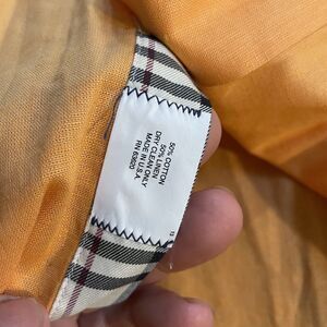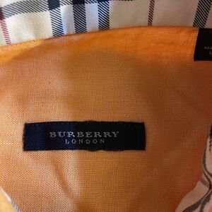 This Burberry London shirt is a stylish addition to any man's wardrobe. Made from a blend of linen and cotton, it is lightweight and comfortable to wear. The shirt features short sleeves, a spread collar, and a button-up closure. It comes in a beautiful orange color with a solid pattern that gives it a classic and timeless look.