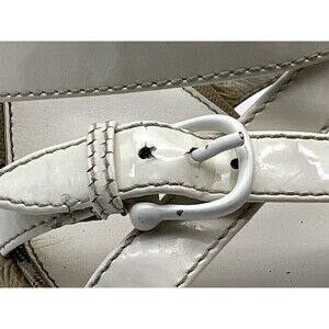 Size 9 US Burberry London White Patent Leather Espadrille Sandals. These chic sandals feature an adjustable slip-on design, making them perfect for any occasion, from a casual day out to a sophisticated cocktail party. The open-toe espadrille style is complemented by a high wedge heel, offering both fashion and function for the modern woman. The sandals boast a timeless check pattern and are crafted with premium patent leather, ensuring both durability and elegance. With a platform height of 3 inches and a heel height of over 3 inches, these sandals provide a comfortable lift. Designed with versatility in mind, they are ideal for the spring and summer seasons and can be paired with a variety of outfits to enhance your coastal-inspired theme.