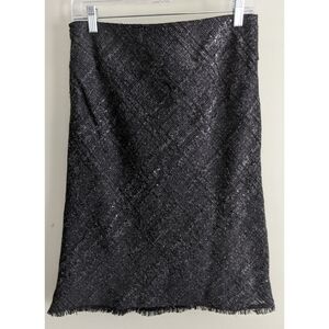 Excellent pre-owned condition. Burberry London skirt. Lined. Side zipper. Nova check piping interior. 59% wool, 12% rayon, 11% polyamide, 11% mohair, 6% polyurethane, 1% cotton. Fringe hem. Size 6.