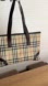 Stylish Burberry tote bag with iconic checkered pattern. Features dark brown handles.