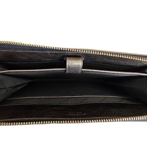 Zip-around style opens three-quarters, revealing two interior compartments lined