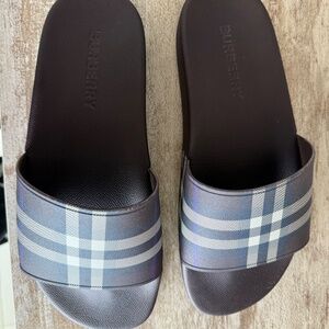 Stylish and comfortable Burberry pool slides featuring the iconic black check design. Perfect for casual wear, beach, or poolside. Authentic luxury with timeless Burberry style. Brand new.