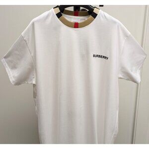 -This version of the Burberry Icon Stripe Trim Cotton T-Shirt comes in an all-white colourway. The only variation to this colourway is the trim around the neckline, which features stripes reminiscent of the brand’s signature checkered pattern that uses stripes of tan, beige, black and red.