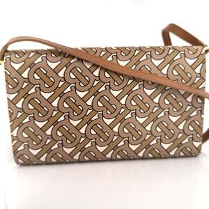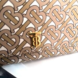 This stunning Burberry crossbody features the brand’s iconic Thomas Burberry (TB) monogram print in beige and camel tones. Crafted in smooth coated leather with gold-tone hardware, it includes the signature “TB” clasp logo, interior card slots, and a zip pocket. Its structured silhouette and adjustable strap make it a versatile day-to-evening piece.