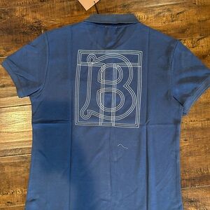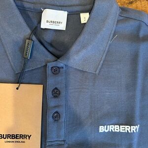 Classic Burberry polo shirt. Features a navy blue color. Embroidered logo on chest. Short sleeves and buttoned collar.