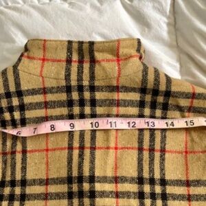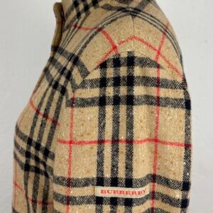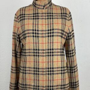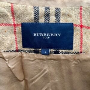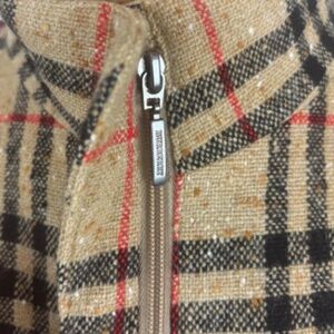 Sleek Burberry Golf Nova check wool tweed, featuring a straight-cut with a nylon zippered closure from the hem to the neck. All zippers are tan nylon with dark nickel finish logo pullers. There are two zippered pockets on the front lined with tan silky fabric. The Burberry label is sewn on the upper arm of the left sleeve.