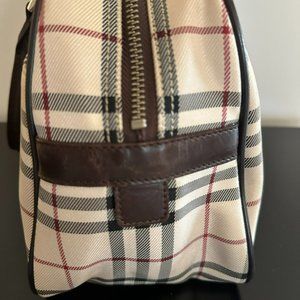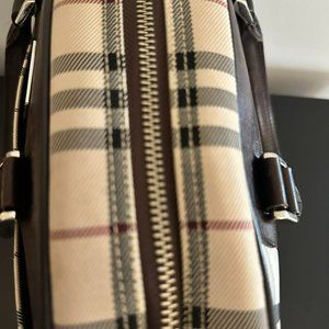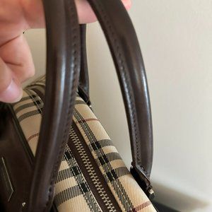 This beautiful Burberry bag is in excellent condition, strong and clean handles, leather is soft and beautiful with minor scuffs (see pictures closeup), the outside of the bag is perfect except for one very small mark on the bottom of the bag (see last picture) interior is perfect, exterior pocket is perfect, zipper is perfect and zips freely. No odor. This is one of the cleanest bags around. Authentic.