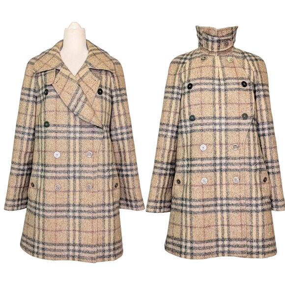 Burberry, Nova Check, plaid, wool, women's coat, long coat, knee length coat, double breasted, pea coat, trench coat, designer, luxury, vintage, authentic, fall, winter, outerwear, jacket, trench, check, classic, beige, brown, red