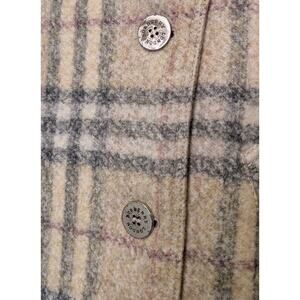 Burberry London long wool coat in muted iconic nova check plaid of neutral beige, navy blue, and red. Size US 14 (or size Large.) Made in Italy of wool & mohair. Double breasted style; can wear fully buttoned up for maximum warmth, or open at front. Overall excellent preloved condition; only visible sign of wear is patina on metal Burberry logo buttons, as shown in photos.