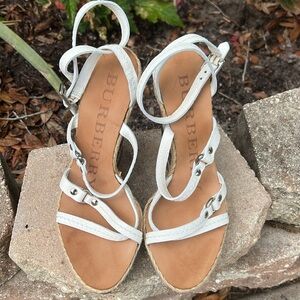 A pair of Burberry wedge sandals. These sandals feature white leather straps, a wedge heel with the Burberry check pattern, and a buckle closure. Absolutely gorgeous! Size 36 1/2 or 6.5 US. Burberry is a British luxury fashion house founded in 1856 by Thomas Burberry. The brand is known for its ready-to-wear fashion, accessories, and fragrances.