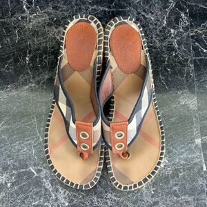 * Detail: These elegant, comfortable & iconic Burberry thong sandals are a Spring/ Summer closet staple. Constructed in beige nova check fabric on the insole & a black nova check front straps, these espadrille designed wedge sandals are completed with gold tone eyelet details on the front leather panel. Made in Spain.