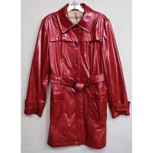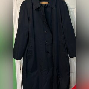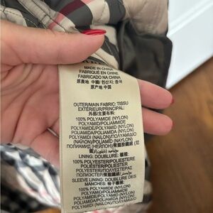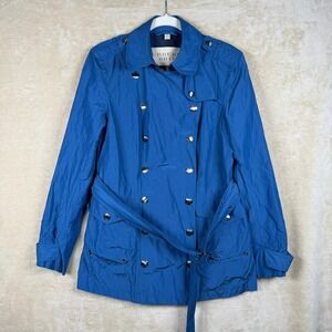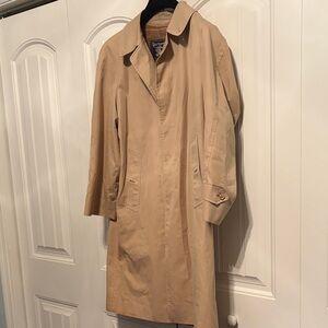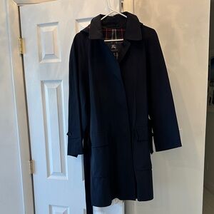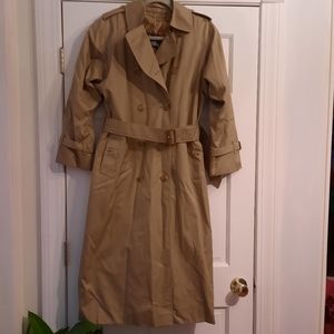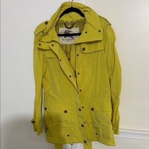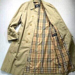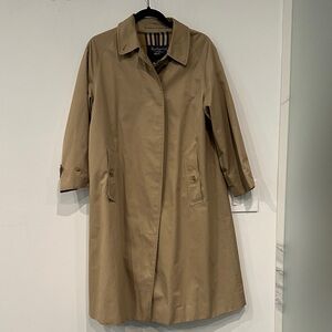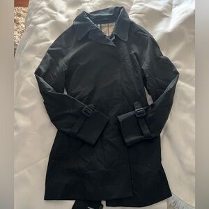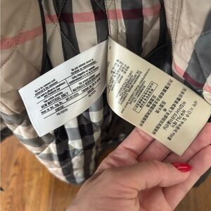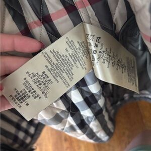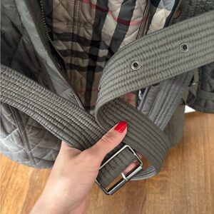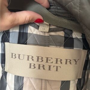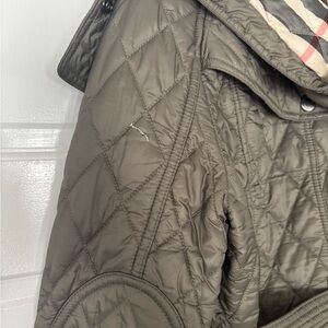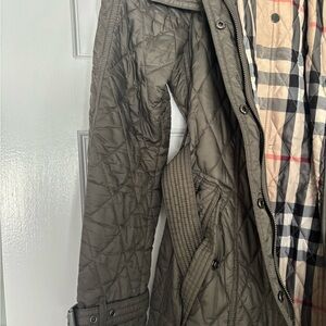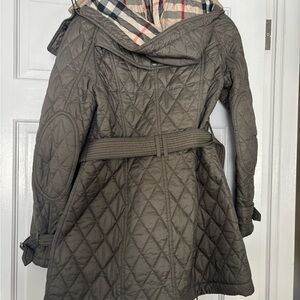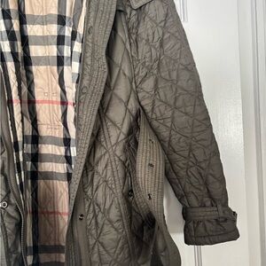 Stylish olive quilted trench coat. Features classic Burberry check lining. Perfect for any season.