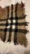 Luxurious wool scarf with fringe. Features olive and rust tones. Elegant and warm small scarf
