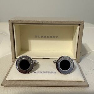 Stylish round cufflinks by Burberry. Features black center with silver accents. Ideal for formal wear.