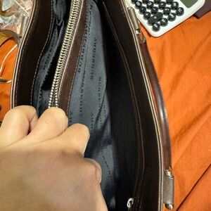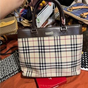 Stylish Burberry tote bag with classic plaid design. Features brown leather handles.