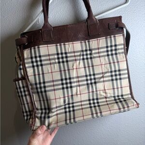 This elegant Burberry tote showcases a timeless Check pattern, complemented by rich brown leather trims. Its structured design and durable handles provide a perfect blend of style and practicality, ideal for professional use.