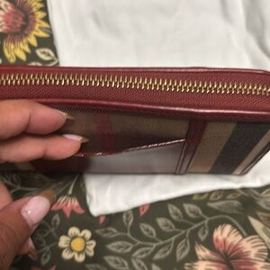 Elegant Burberry wallet with signature plaid design. Features rich red leather trim. Ideal for stylish outings.